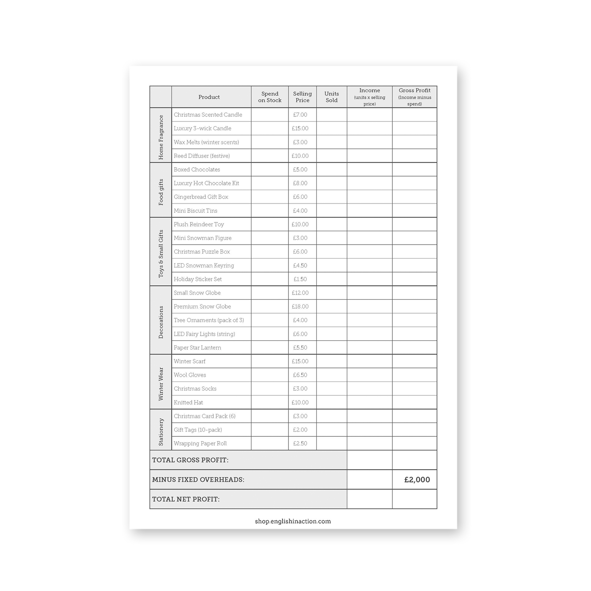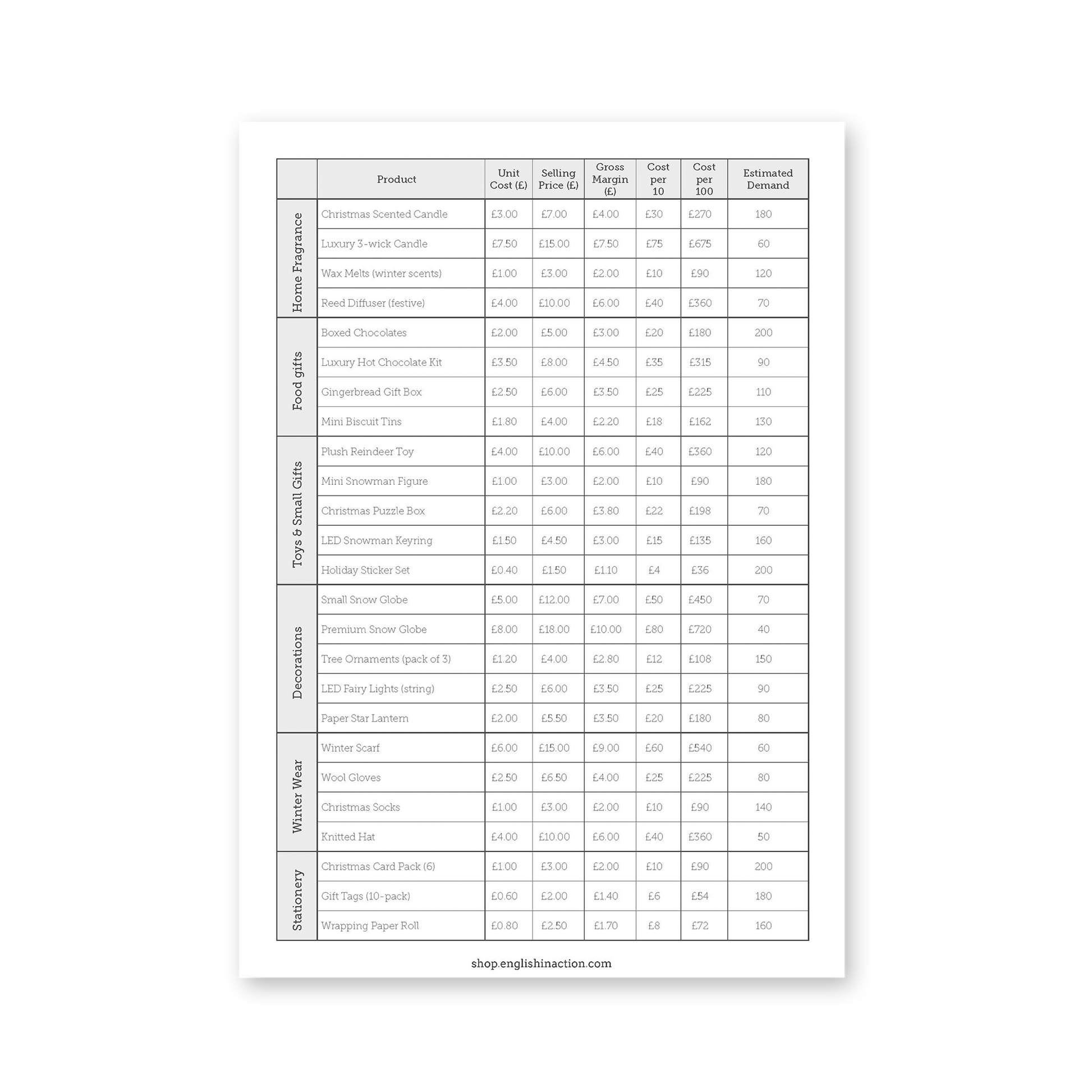 Give your students a practical, real-world task with the Christmas Shop Simulation, a team activity where learners run a small Christmas shop with the goal of making the highest net profit. Students choose their stock within a set budget, work through six Event Cards and calculate income, gross profit and final net profit using the provided sheets.