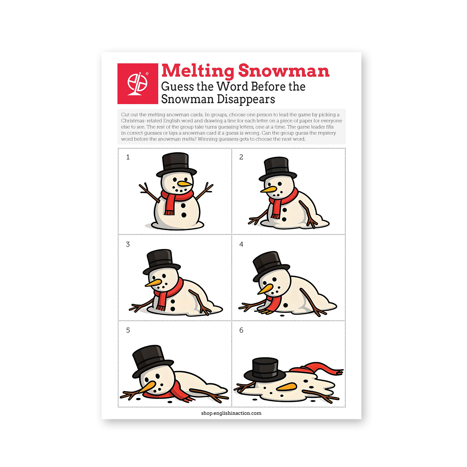 The resource includes six illustrated melting snowman stages. Students work in groups: one chooses a word, draws blank spaces for the letters and the others guess one letter at a time. Every incorrect guess reveals the next melting snowman card. If the snowman disappears completely before the word is solved, the chooser wins. Then groups swap roles and play again.