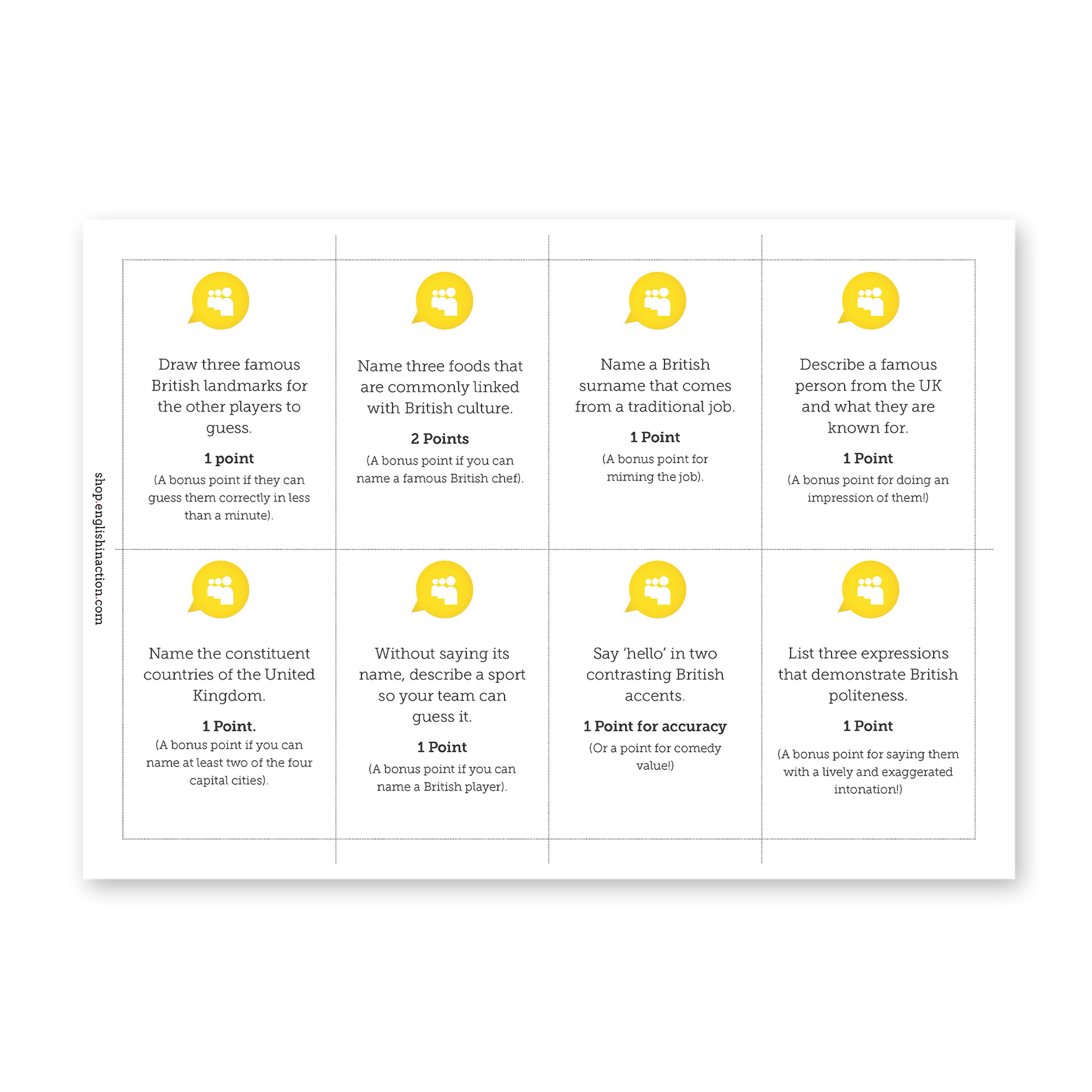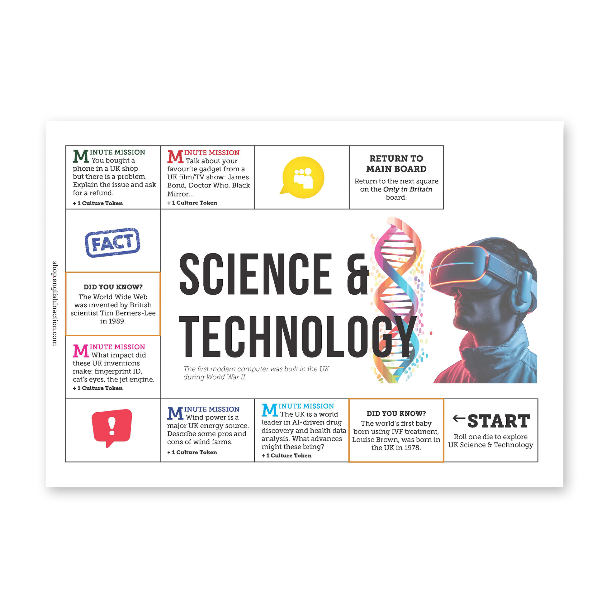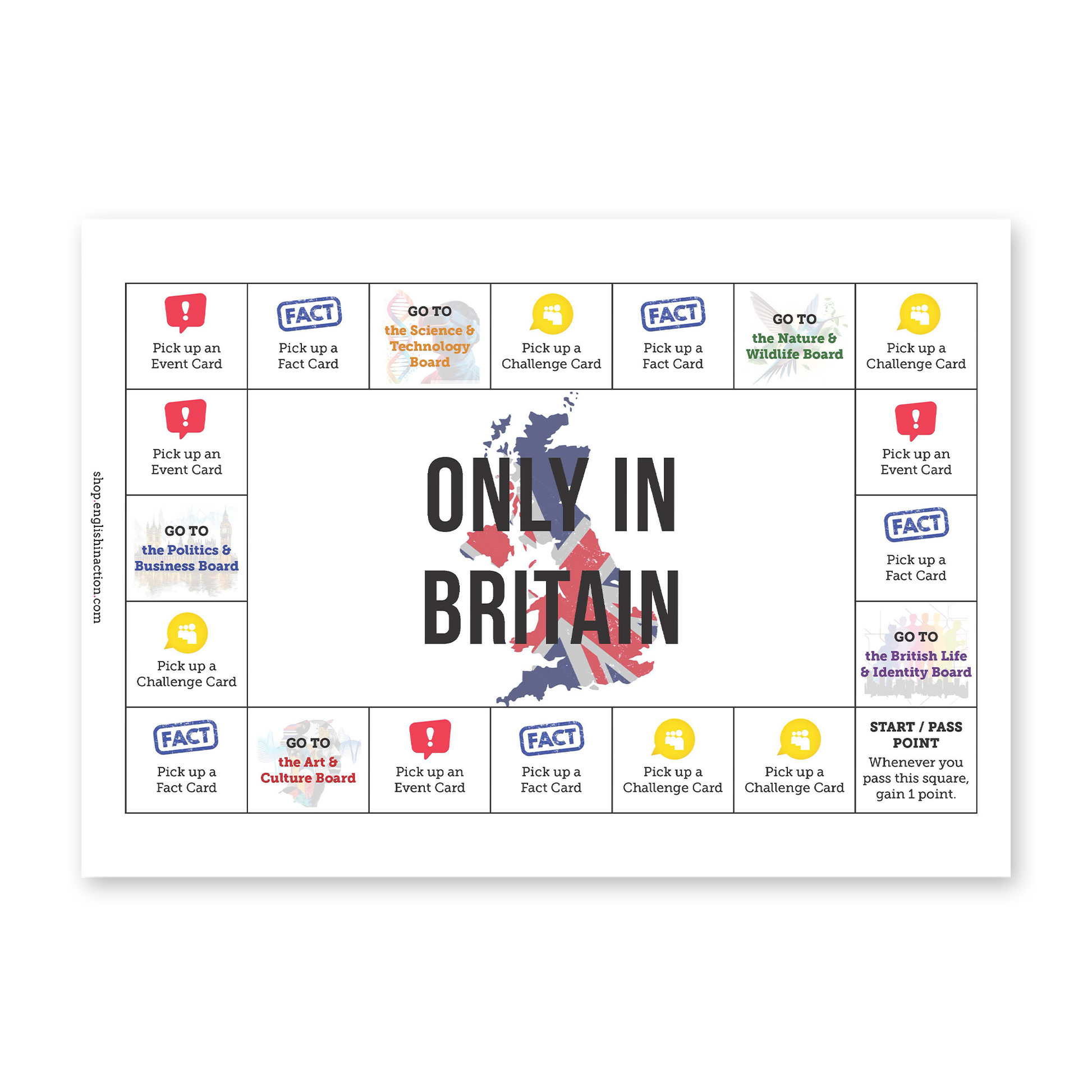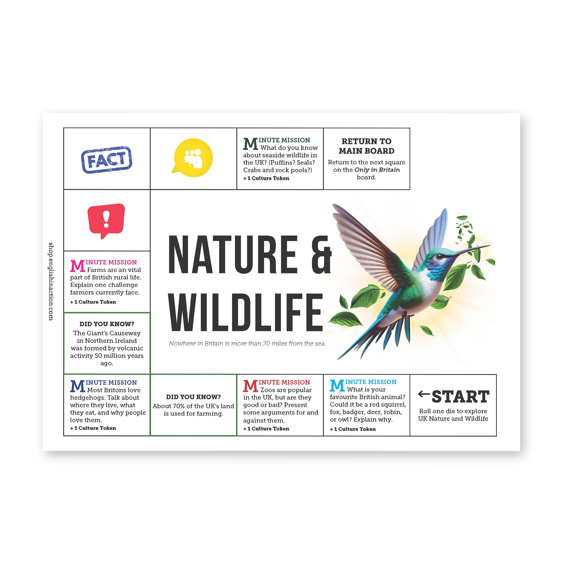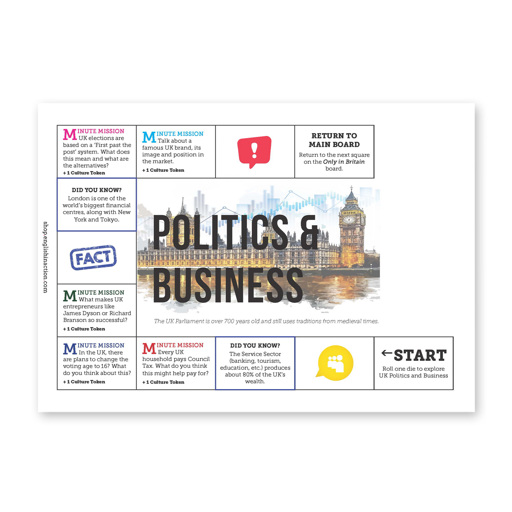 Bring British culture to life with a board game designed to get students speaking, thinking and learning about the UK. Players move around a main board, visit five topic boards, and complete a mix of quick challenges, cultural facts and timed speaking tasks. Along the way, teams earn Culture Tokens linked to specific British themes: Art & Culture, Politics & Business, Science & Technology, Nature & Wildlife, and British Life & Identity.