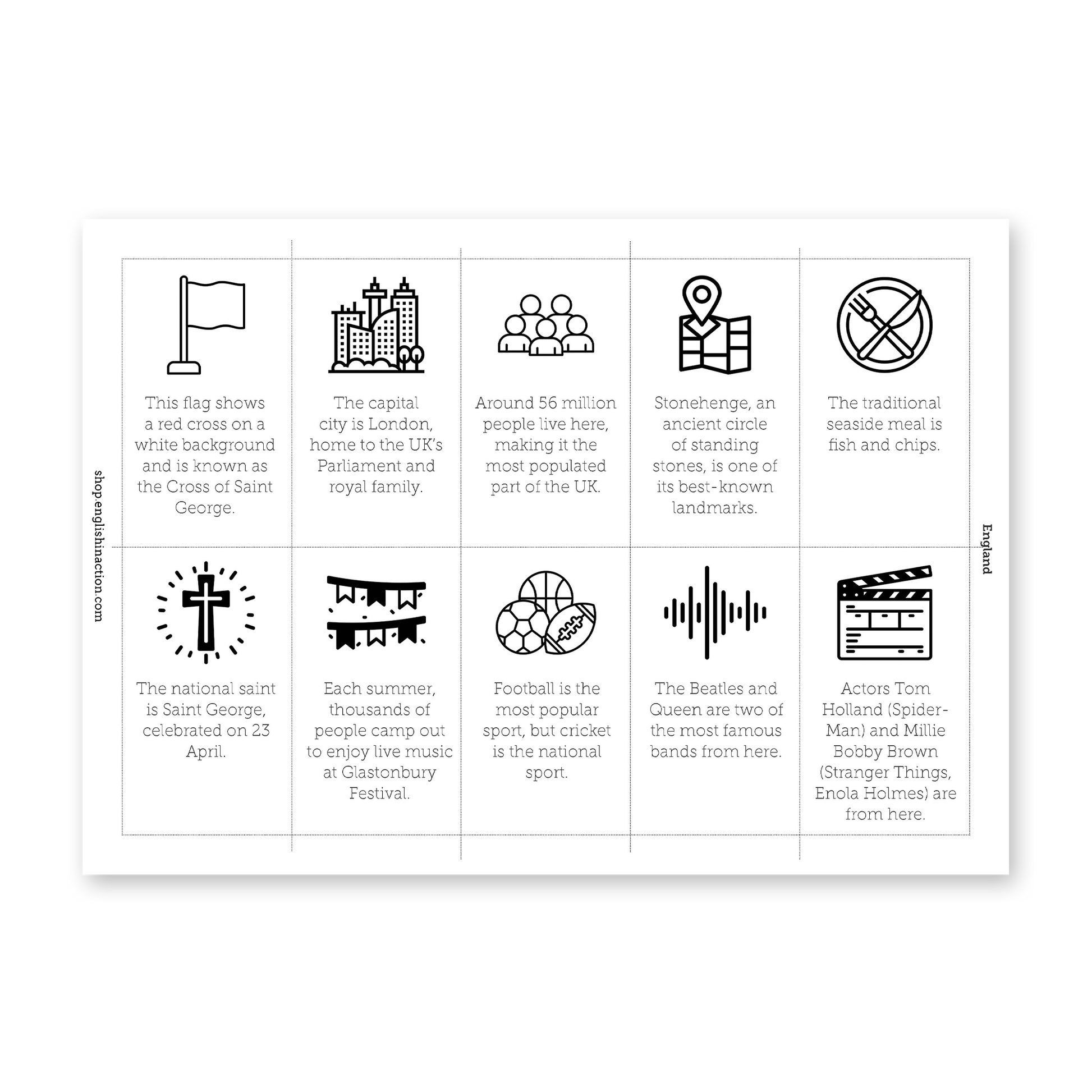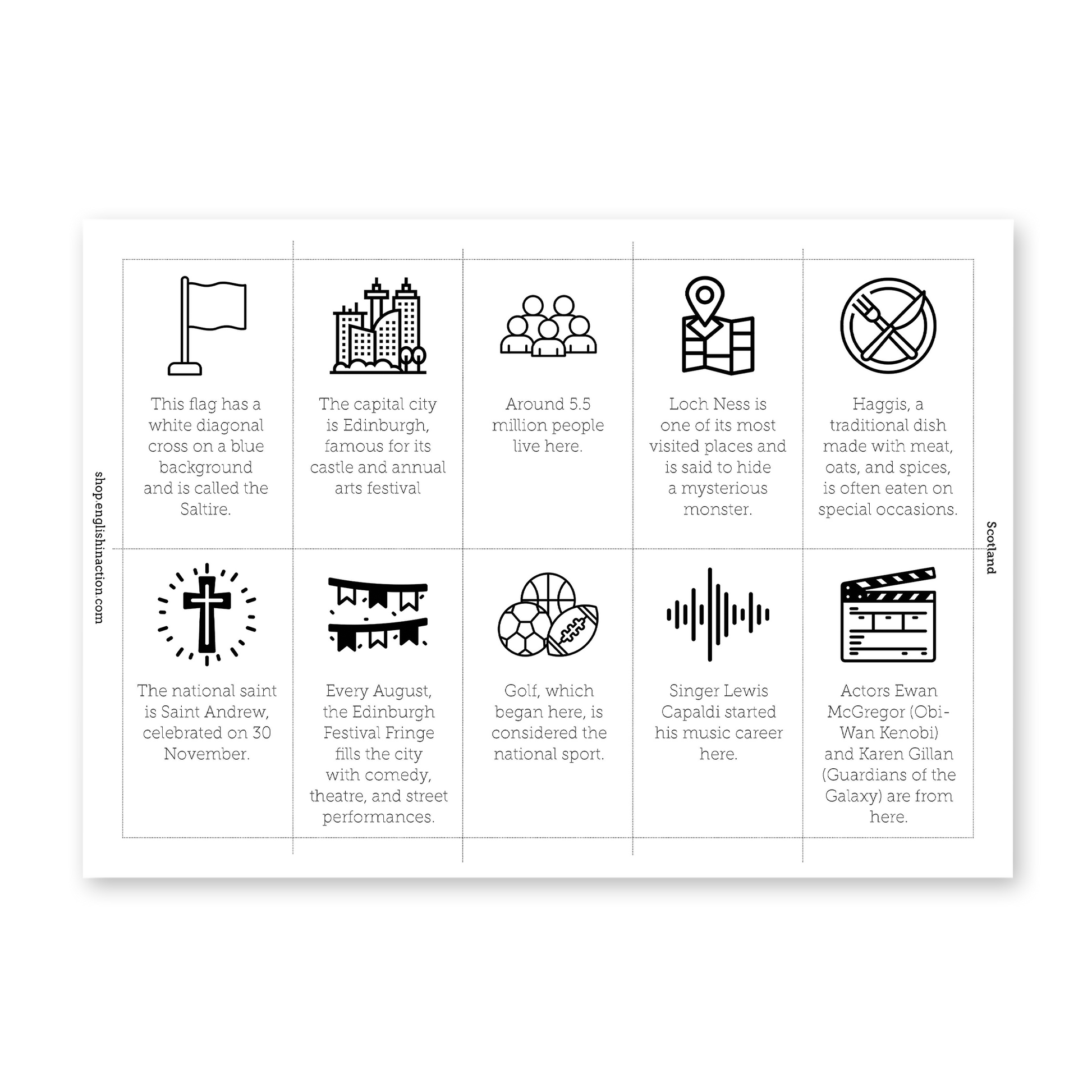 Introduce students to the four nations of the United Kingdom with this clear reading text and an engaging card-sorting activity. Learners read about England, Scotland, Wales and Northern Ireland, then work with 40 fact cards to decide which nation each fact belongs to. The activity builds geographical knowledge, cultural awareness and reading comprehension through practical group work.